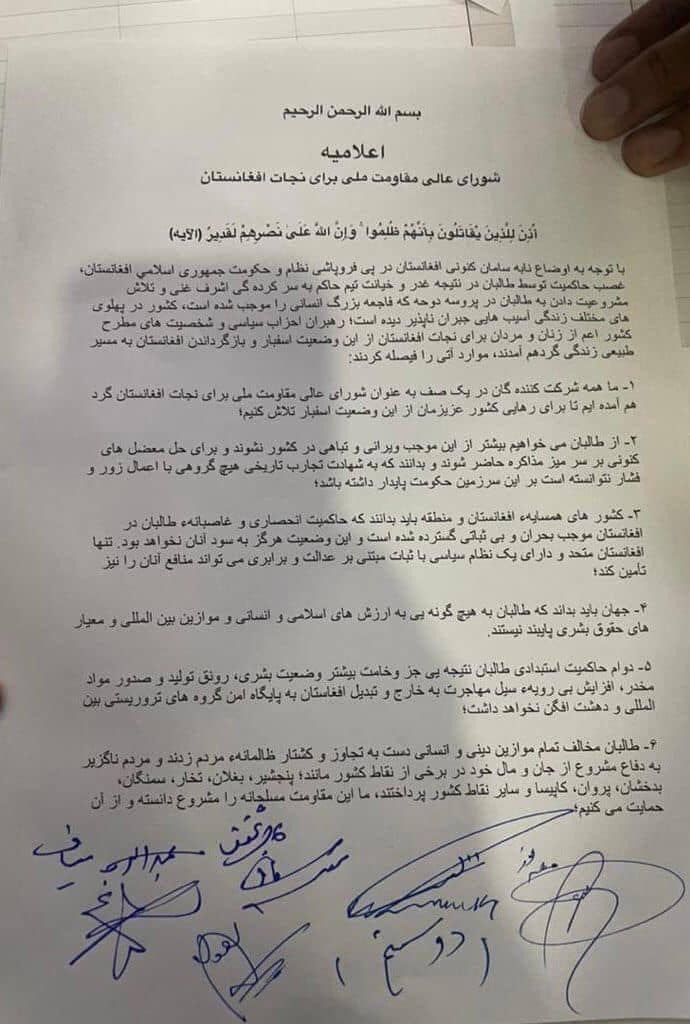 اعلامیه تحت نام «شورای عالی مقاومت ملی برای نجات افغانستان !؟ » بتاریخ 27/ثور/ 1401 هجری شمسی در فضای مجازی از آدرس راهبران سیاسی !؟ و شخصیت های مطرح !؟ دست به دست می شود که حاوی 7 ماده بوده و تعداد امپرا پفک ها و اشتر ژنرال های دو کوهانه در پایین آن امضا نموده اند .