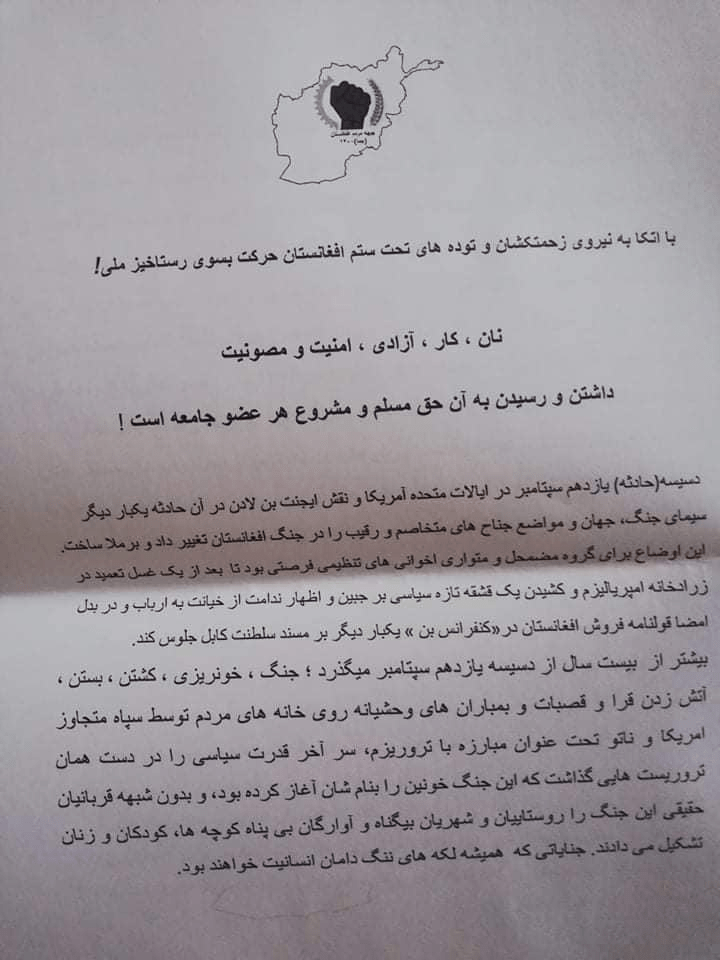 اولین شیپور رستاخیز ملی بر ضد امارت طالبانی و اسلاف بنیادگرای ان در داخل افغانستان به صدا درامد . صدای رسای : «نان ، کار ، آزادی ، امنیت و مصونیت؛