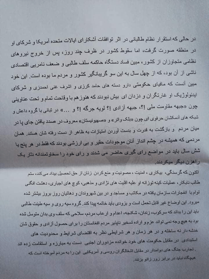 زنده باد رزمندگان شجاع و دلیر مردم افغانستان . زنده باد جوانان پرشور و با صلابت جما . زنده و مستدام باد جنبش روشنگری بانوان با شهامت . نابود باد استبداد طالبانی . نابود باد قوادان سیاسی و مزدبیگر های معامله گر .