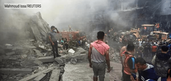 اسرائیل در پاسخ به موج حملات فلسطینی که از صبح شنبه آغاز شد، و در جریان آن به کشتار غیرنظامیان اسرائیلی منجر شد – طبق گزارش شبکه تلویزیونی کان، تعداد کشته شدگان به ۸۰۰ نفر رسید – با به کار گیری جنایات جنگی و بدون توجه به تلفات غیرنظامیان غزه پاسخ داد. در شبکه های اجتماعی اتهاماتی مطرح شد مبنی بر اینکه دولت اسرائیل پناهجویان را به مکان هایی هدایت می کند که بعداً بمباران می شوند، مانند اردوگاه پناهندگان جبالیا.