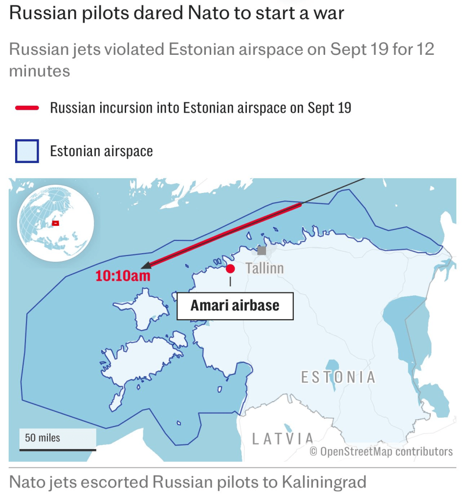 در ده سال گذشته، روسیه حداقل ۴۰ بار فضای هوایی استونی را نقض کرده است – یک بار یک جت رئیسجمهور پوتین را به هلسینکی برای دیدار با ترامپ در ۲۰۱۸ منتقل کرد. اما بیشتر این نقضها شامل عبور از اطراف جزیره خالی از سکنه واندلو با هواپیماهای قدیمی و تنها بود. این بار، سه جنگنده سنگین دستکم پنج مایل وارد فضای هوایی استونی شدند و هرچند روسها دستورالعملهای رهگیری بینالمللی را رعایت کردند، مسیر خود را تغییر ندادند.