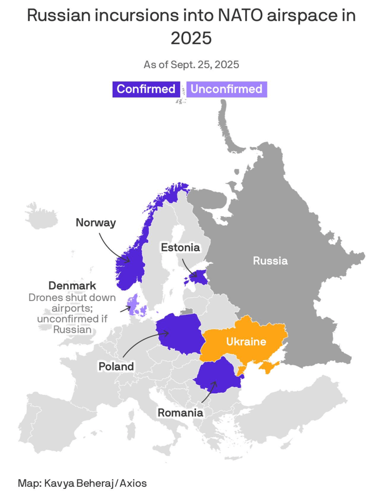 • ۱۹ سپتامبر: سه جت جنگی روسی برای ۱۲ دقیقه با ترانسپوندرهای خاموش وارد فضای استونیا شدند؛ آشکارترین نقض تا امروز.