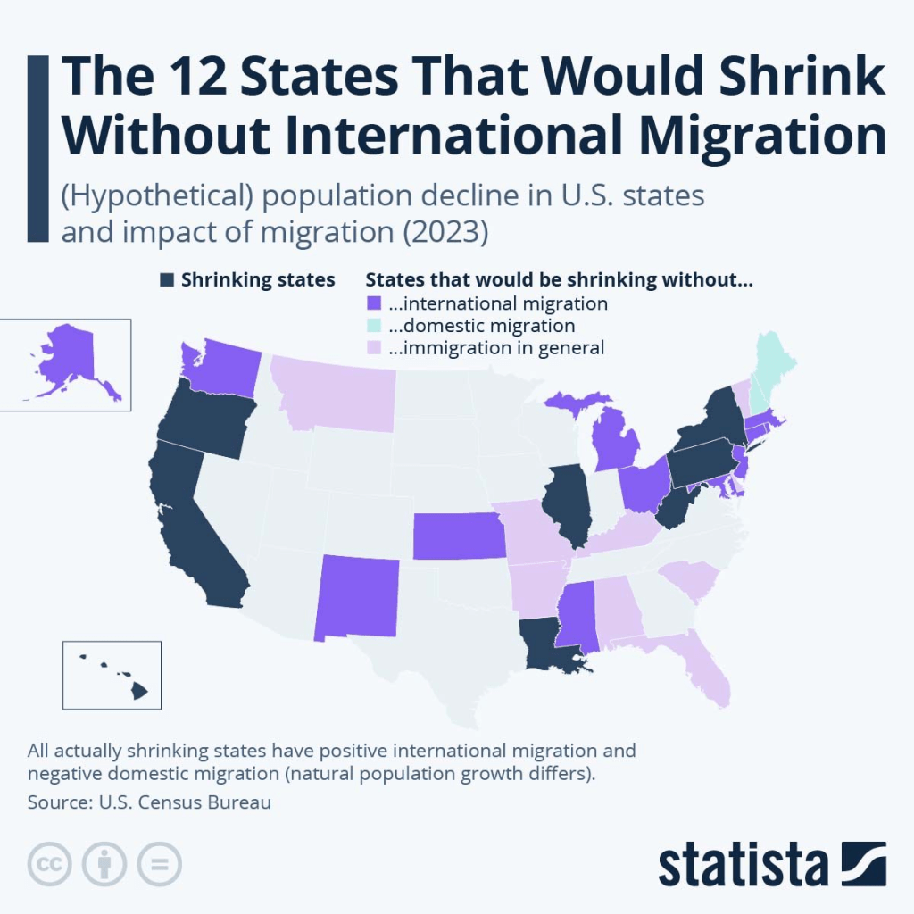 این نقشه ایالات آمریکا را نشان میدهد که بدون مهاجرت بینالمللی جمعیت آنها کاهش مییابد و اهمیت مهاجرت برای حفظ جمعیت و رشد جمعیتی در ایالات مختلف را نمایان میکند.