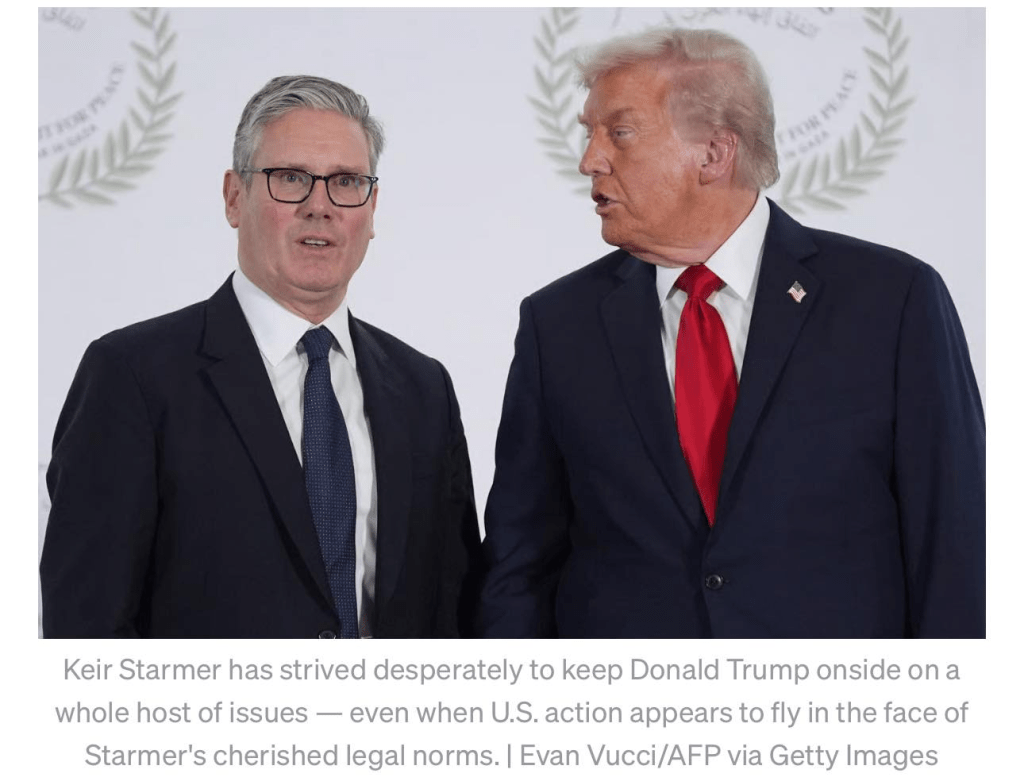اما او در مقام قدرت، بهگونهای آشکار کوشیده است در طیف گستردهای از موضوعات، رابطهٔ خود را با ترامپ حفظ کند — حتی در مواردی که اقدامات ایالات متحده ظاهراً با هنجارهای حقوقیای که استارمر عمیقاً به آن باور دارد، در تضاد قرار میگیرند.