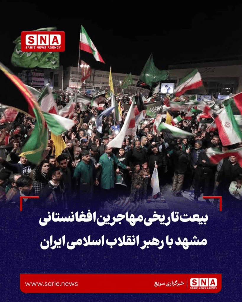 خبرگزاری وابسته به رژیم ارتجاعی جمهوری اسلامی ایران گزارشی تحت عنوان بیعت مهاجرین افغانستانی به رهبر جدید ) این کشور منتشر نموده که متن گزارش : (به اساس گزارش خبرگزاری سریع؛ هزاران تن از برادران و خواهران مهاجر افغانستانی مقیم شهر مشهد ایران در یک حرکت خودجوش و مردمی، با برگزاری اجتماع عظیمی، وفاداری تزلزلناپذیر خود را با رهبری جمهوری اسلامی ایران، آیتالله سید مجتبی خامنهای، تجدید میثاق کردند.